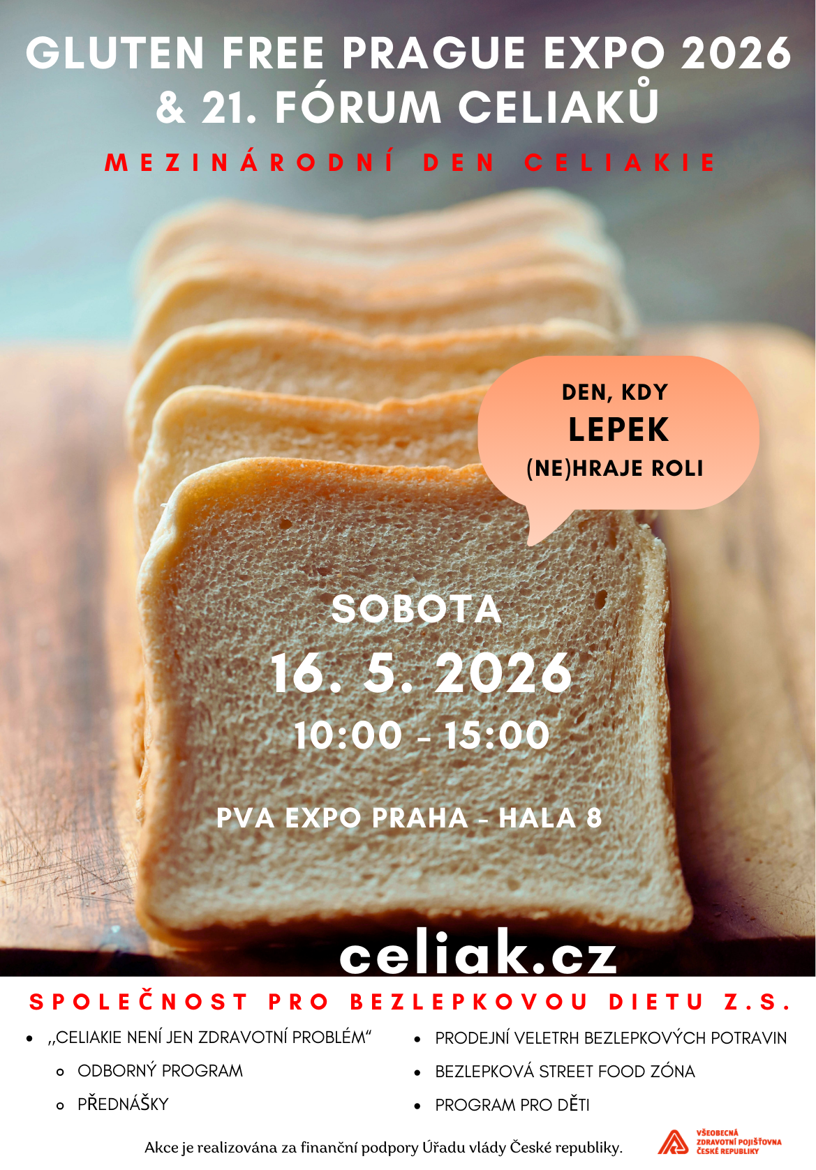 Novinky a články Novinky a články / Akce 21. Fórum celiaků – Gluten Free Prague Expo 2026 2. 12. 2025 Akce Srdečně vás zveme na 21. Fórum celiaků, které se uskuteční v sobotu 16. května 2026 od 10:00 hodin na Mezinárodní den celiakie.Těšit se můžete na přednášky odborníků, diskuzní fórum, setkání lidí s bezlepkovou dietou a také na prodejní bezlepkový veletrh GLUTEN FREE PRAGUE EXPO 2026, kde budete moci ochutnat a zakoupit široký výběr bezlepkových výrobků.Pro děti bude připraven divadelní program Ilegumovy divadelní společnosti.Akce je realizována za finanční podpory Úřadu vlády ČR, partnerem akce je Všeobecná zdravotní pojišťovna ČR.👉 Více informací a program akce najdete zde.Pro výrobce a prodejce bezlepkových potravin:chcete se zúčastnit akce jako vystavovatel?přihlaste se na celiak@celiak.czvystavovatelé smí nabízet pouze výrobky, které splňují parametry výrobků vhodných pro bezlepkovou dietu!